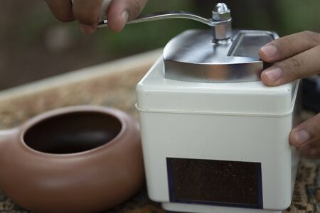 the image man grinds the coffee grinder in his hands