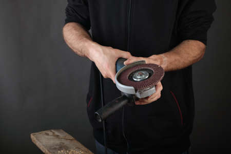 the person holds an angle grinder in his hands on a gray background