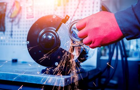 metal treatment. Grinding of steel. Sparks from disk. Work in workshop. design details.