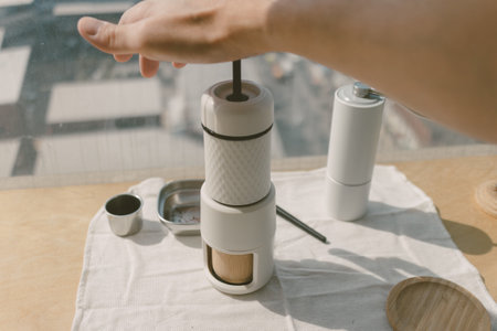 Making espresso by pressing coffee. Happy morning activity routine.