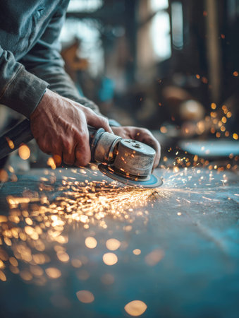 worker using a power tool to grind a metal surface, creating a skilled shower of brilliant, dynamic sparks. The focus on the tool and the process highlights the hard work and craftsmanship involved in metal fabrication and heavy industry.