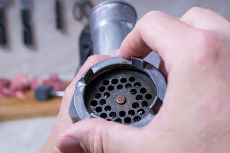 a person assembles a meat grinder-he attaches the grate with a locking disc to the shaft,