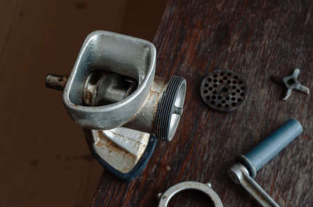 Disassembled manual vintage meat grinder on wooden table. Hand tool for grinding various products. Antique kitchen utensils.