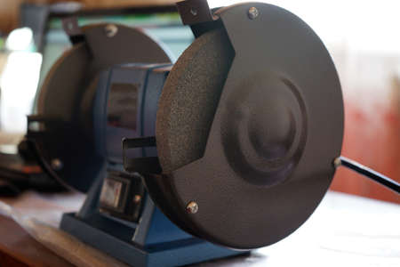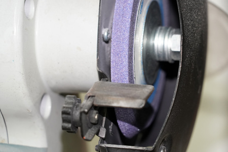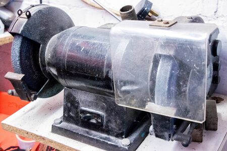 The machine for sharpening. Work Desk in the workshop. The right tools to work with.