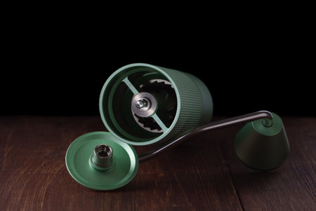 Green manual coffee grinder with metal millstones is open on a wooden table.