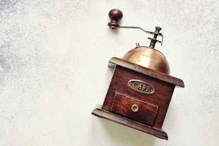 Antique vintage retro wooden coffee grinder with ingredient for making drink on a light slate, stone or concrete background.Top view with copy space.