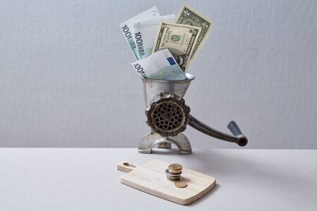 Downturn and bank or financial crisis. Inflation and depreciation money concept. Grinder grinding banknotes into coins