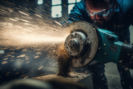 Spark flying from a Worker's Angle Grinder in a Busy Workshop