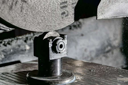 Professional mechanic man is cutting steel metal with rotating carbon blade cutter. Steel industry and workshop concept.