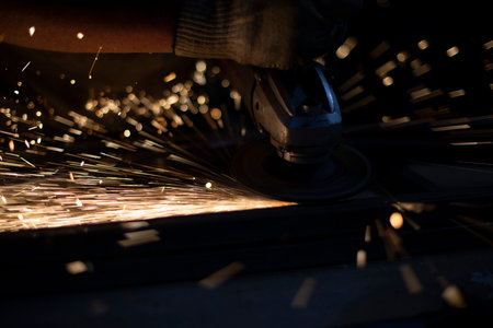 Worker working with a circular grinder on a metal with sparks flying out of them, selective focus