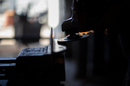 A close-up image of a grinding wheel in a workshop, showcasing the motion and sparks produced during the grinding process. Shavings scatter, illustrating the dynamic environment of craftsmanship and manual labor.