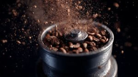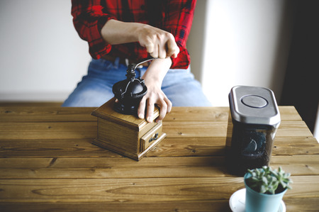 A close-up shot capturing the hand of a person grinding roasted coffee beans using a manual grinder on a wooden surface.
