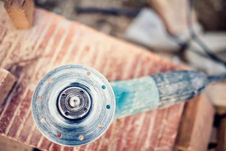 angle grinder on construction site for cutting bricks, debris. Tools and bricks on new building site