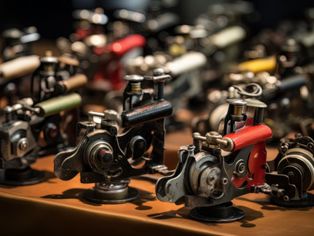 Bench grinder for locksmith's work on a wooden table. Locksmith accessories for small repairs. Interior of locksmith's workshop.