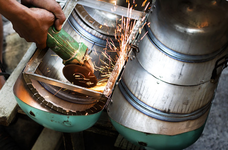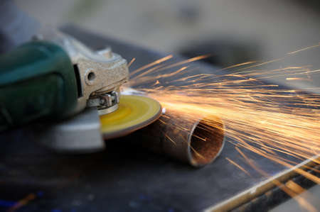 Workers using a metal grinding machines to cut workpieces made of steel, making a flash of sparks.