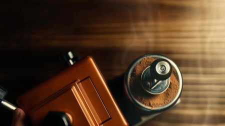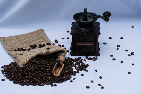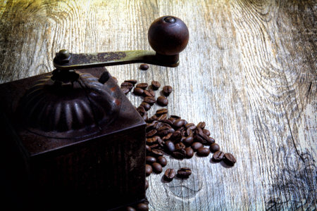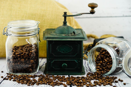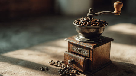 roasted coffee beans scattered on a table a coffee grinder with a wooden case