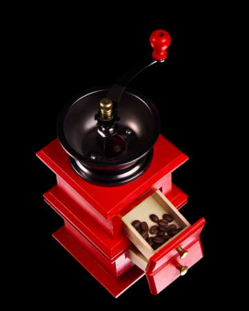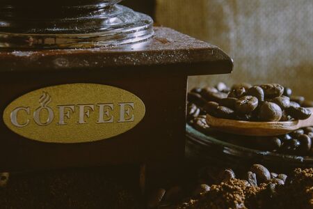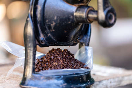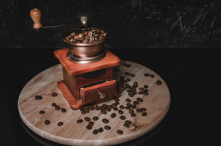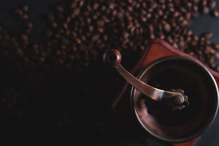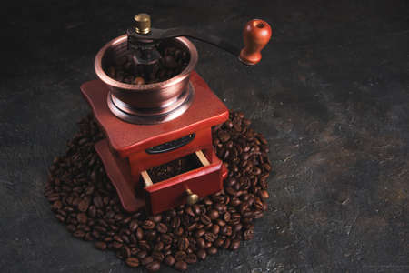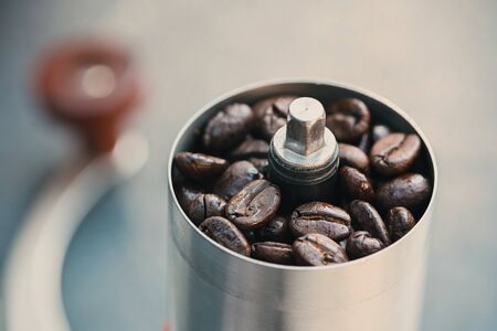 Coffee beans in a hand grinder, closeup roasted coffee beans into a manual coffee grinder