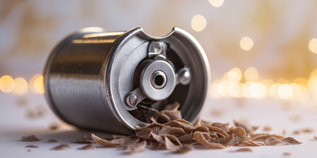 Metal can rests on a surface, releasing wood shavings while soft light glimmers in the background during a calm afternoon