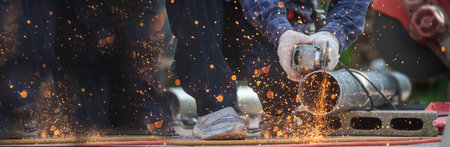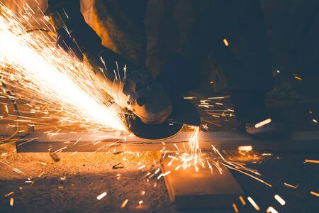 Worker man using electric wheel grinding and cutting on steel structure have spark from the grinding wheel at production industrial