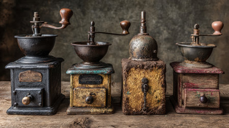 Row of four vintage manual coffee grinders displayed on a rustic wooden table. Each grinder shows unique wear, patina, and aged textures, ranging from cast iron to wood and brass