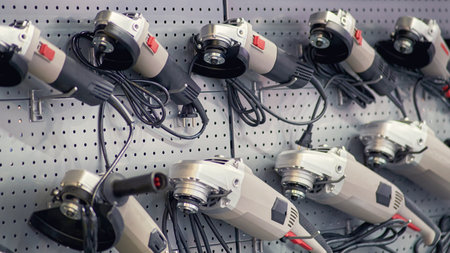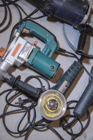 A professional tool for work, repair and construction in the store. Sale of wired power tools and battery powered equipment in the shop