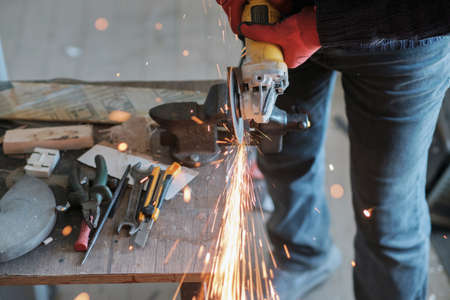 Close up Locksmith works with grinder machine, fly bright sparks. A man hand grinds a metal in workshop, Sparks in metalworking.