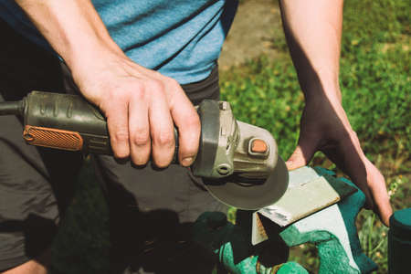 Grinding steel. Worker grind metal. work in garage. Electric tool in hand. Create flat surface.