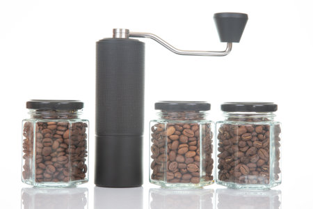 black manual coffee grinder for coffee beans and three glass transparent jars with black lids filled with roasted coffee beans and earthenware for brewing coffee on a white background. kitchen utensils for coffee.