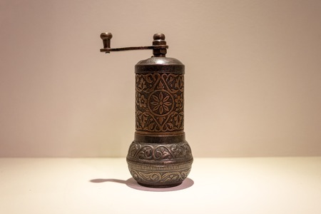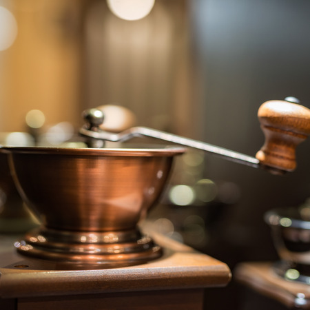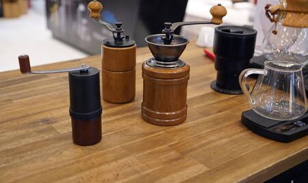 Vintage coffee grinder. Two manual coffee grinders for grinding coffee beans on table.