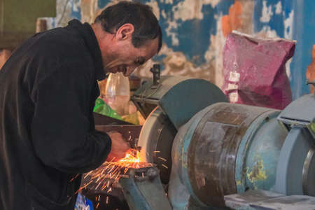 Krasnodar, Russia - October 10, 2011: A man sharpens a drill on emery