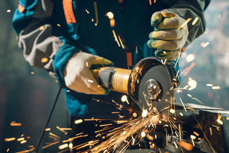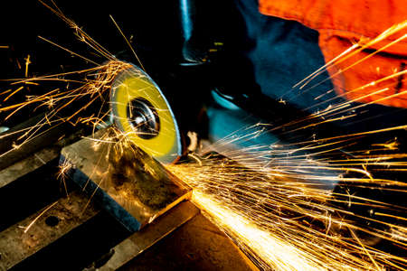 Worker cutting metal with grinder. Sparks while grinding iron.