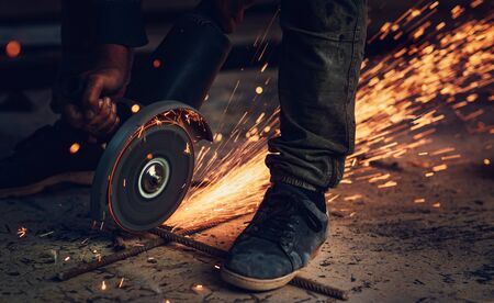 construction industry details - close up of metalworker using disc grinder for cutting metal