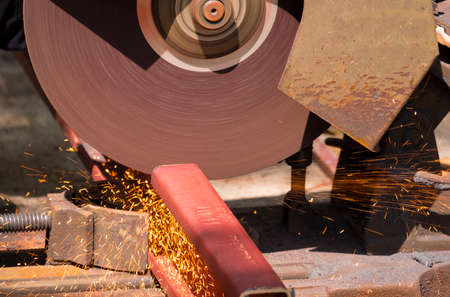 Close up image of the old circular grinder cutting red lip channel steel in construction site