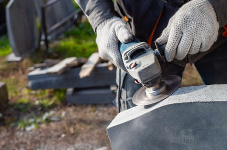 Man's hands holding angle grinder and grinding a stone. Close view.