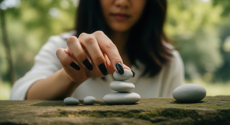 Woman hand with dark nails carefully stacks smooth grey pebbles on a textured surface outdoors. represents balance, focus, mindfulness, and tranquility in a natural setting.