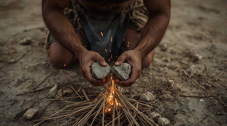 Primitive fire-making technique with gray rocks and rough hands in focus