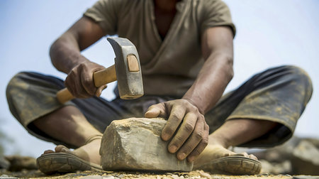 Laborer performs intense manual labor breaking stone to support livelihood and daily survival