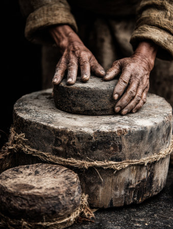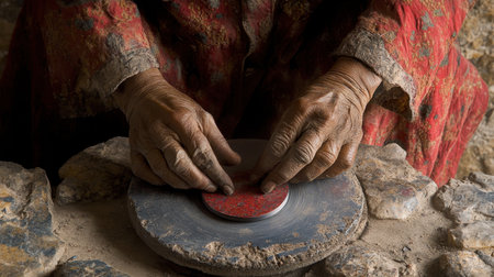 An artisan skillfully shapes pottery using a stone wheel, highlighting traditional craftsmanship. The image captures the intricate details of hands working with natural materials, demonstrating the artistic process in a rustic workshop setting.