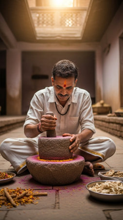 a medicine man grinding neem leaves and turmeric for making medicine