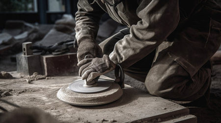 Stone craft worker squats while cutting stones using a grinder in the workshop