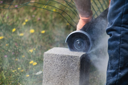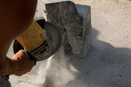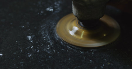 Marble cutting at construction site close up industrial tool, grinder piece of granite stone