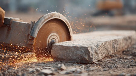 Detailed view of a diamond blade cutting stone, producing sparks in a construction area, showcasing the craftsmanship and precision of the process in action.