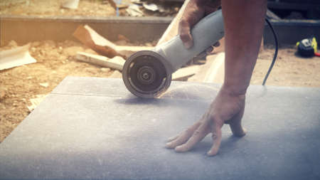 Home renovation, tiler cuts the tile with an angle grinder.