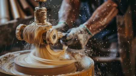Close-up of a carpenter using a wood lathe, with wood shavings flying around, capturing the dynamic motion and craftsmanship.