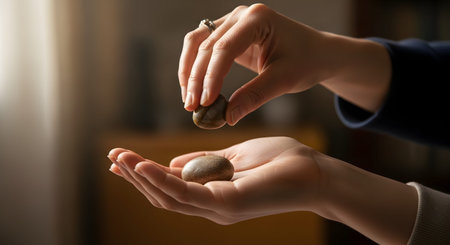Close-up of female hands gently holding two smooth river stones against a blurred, warm background. The image conveys a sense of mindfulness, balance, and connection to nature through the tactile interaction with simple natural objects.