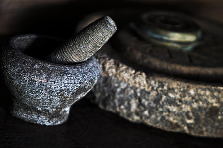 Close-up view of an ancient mortar and pestle set resting on a rustic stone surface, showcasing the craftsmanship and historical significance in traditional cooking.