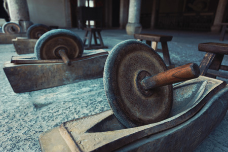 Millstones of an old retro vintage hand mill. Background with copy space for text or inscriptions.