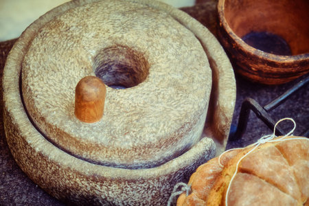 Hand millstones for making bread in ancient Rome. Reconstruction with the preparation of bread in the ancient Roman way. Retro lifestyle cooking.