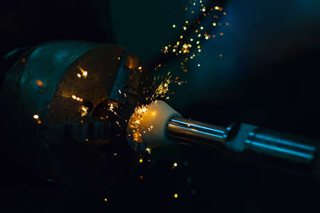 Industrial background, industry, Sparks from grinding machine in workshop.