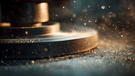 Close-up of a coarse, textured abrasive wheel against a dark background. tiny particles are suspended in mid-air, the wheel s function in grinding and polishing, essential for industrial and manufacturing processes. Generative AI